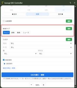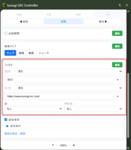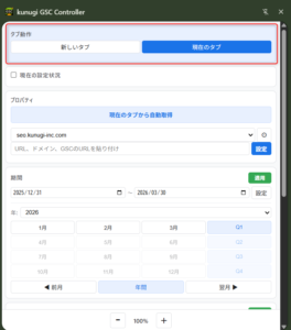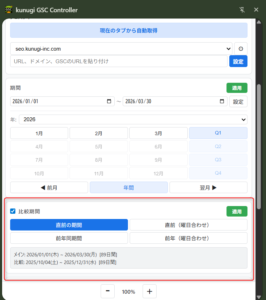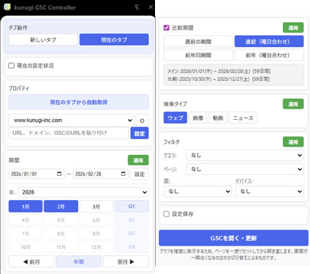 kunugi GSC Controllerは、Google Search Console(以降、GSC)の検索パフォーマンス画面を、サイドパネルから素早く操作できるchromeの拡張機能です。