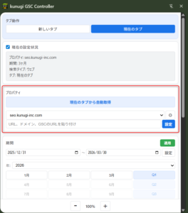 複数サイトのプロパティを登録しておき、ワンクリックで切り替えることができます。また、現在開いているGSCタブからプロパティや設定を自動取得する機能も搭載しているため、初回設定の工数を削減できます。