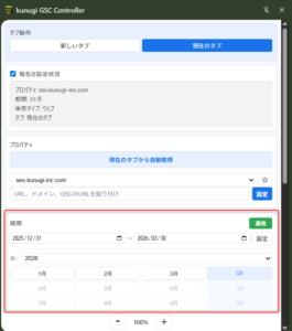 GSCでは「月ごと」のフィルタ設定に手間がかかりますが、本拡張機能では月ボタン・四半期ボタンで期間をワンタッチで選択できます。月ボタンを2回クリックすることで任意の複数月範囲を指定することも可能です。カスタム日付による自由な期間指定にも対応しています。
